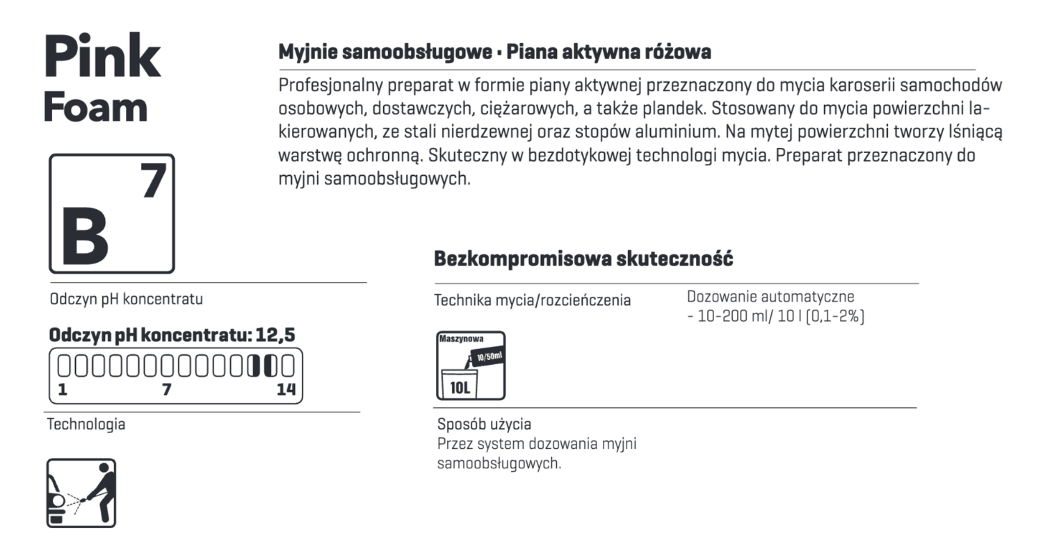 Skuteczny w bezdotykowej, wysokociśnieniowej technologi mycia. Preparat przeznaczony do myjni samoobsługowych.