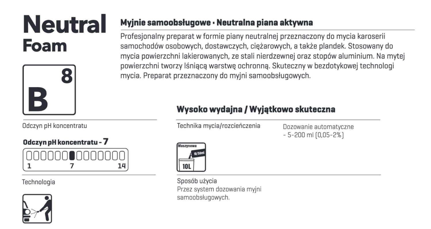 Septa Neutral Foam B8 to piana aktywna o neutralnym pH klasy profesjonalnej zaprojektowana do kompleksowej pielęgnacji karoserii wszelkich typów pojazdów - osobowych, dostawczych i ciężarowych oraz pokryć plandekowych. Bezpieczna dla elementów lakierowanych, komponentów ze stali szlachetnej i konstrukcji aluminiowych. Tworzy ochronny film nadający połysk po zastosowaniu. Zoptymalizowana do współpracy z systemami wysokociśnieniowymi w technologii bezdotykowej. Formuła dedykowana punktom samoobsługowym oferującym usługi mycia pojazdów.