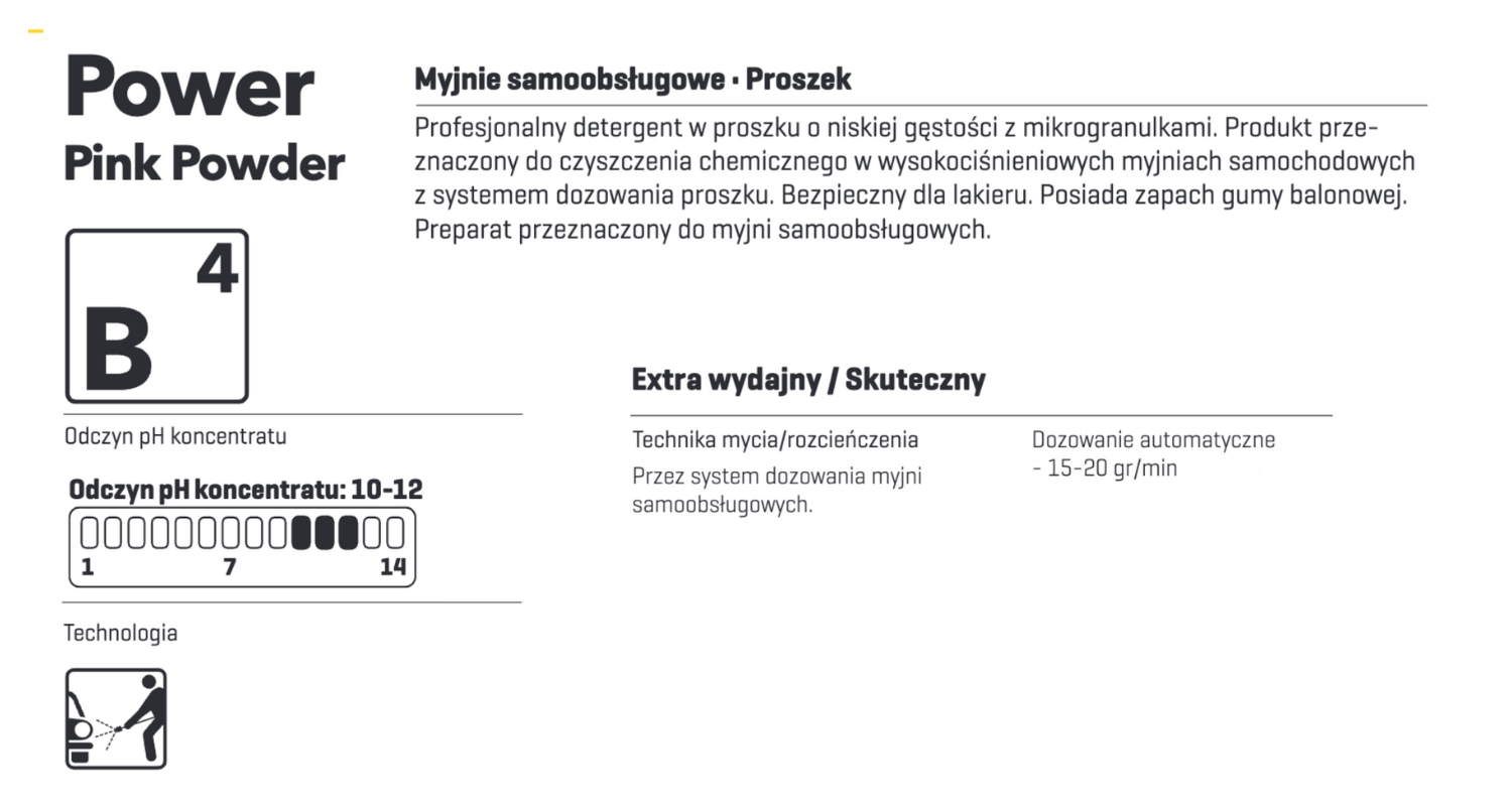 Septa Power Pink Powder B4 to specjalistyczny preparat proszkowy klasy profesjonalnej, wzbogacony mikrogranulkami czyszczącymi. Formuła stworzona do użytku w samoobsługowych systemach myjących wysokiego ciśnienia z automatycznym dozownikiem proszku. Delikatny dla powierzchni lakierowanych. Wyróżnia się charakterystycznym aromatem przypominającym gumę balonową. Produkt dedykowany do wykorzystania w myjniach działających w systemie samoobsługi.