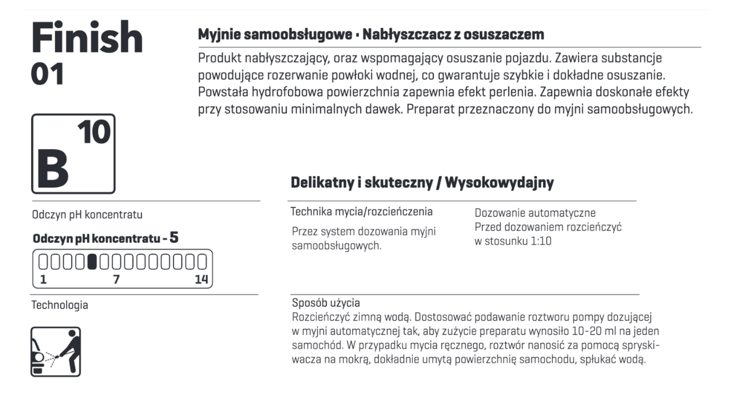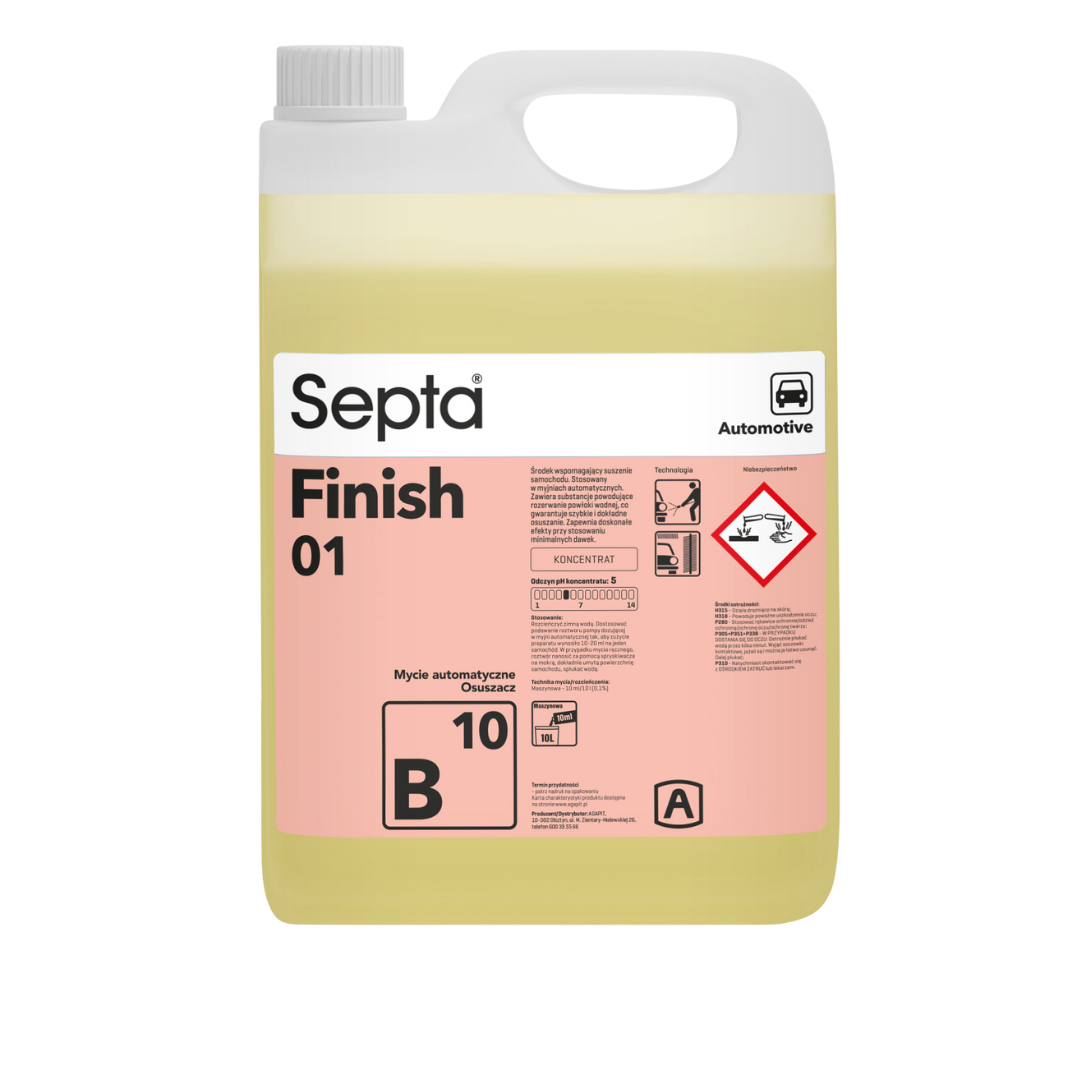 Septa Finish 01 B10 to Specjalistyczny środek o podwójnym działaniu — nabłyszczającym i przyspieszającym schnięcie pojazdu. Zawiera aktywne składniki rozbijające strukturę warstwy wodnej, co zapewnia efektywne i kompleksowe osuszanie. Wykazuje wysoką skuteczność nawet przy zastosowaniu niewielkich ilości preparatu. Formuła opracowana z myślą o zastosowaniu w punktach mycia samochodów działających w systemie samoobsługowym.