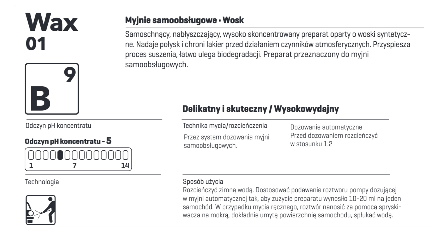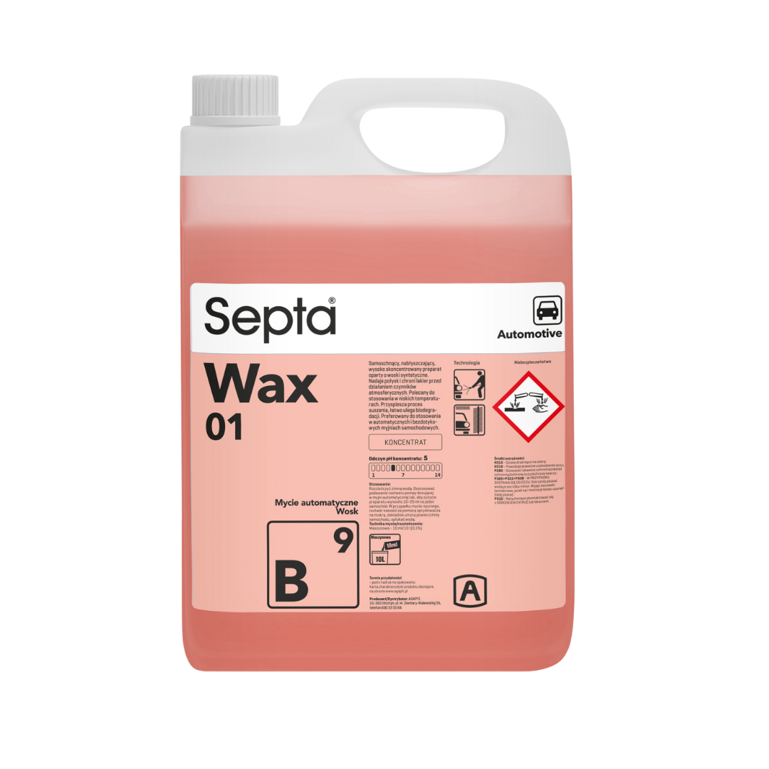 Septa Wax 01 B9 to skoncentrowana formuła nabłyszczająca z właściwościami samoschnącymi bazująca na syntetycznych komponentach woskowych. Zapewnia efekt lustrzanego połysku i tworzy barierę ochronną przed negatywnym wpływem warunków pogodowych. Szczególnie rekomendowana do użytku w chłodnym otoczeniu. Znacząco skraca czas schnięcia pojazdu, a jednocześnie pozostaje przyjazna środowisku dzięki łatwej biodegradowalności. Produkt przeznaczony do użycia w autonomicznych stacjach mycia pojazdów.