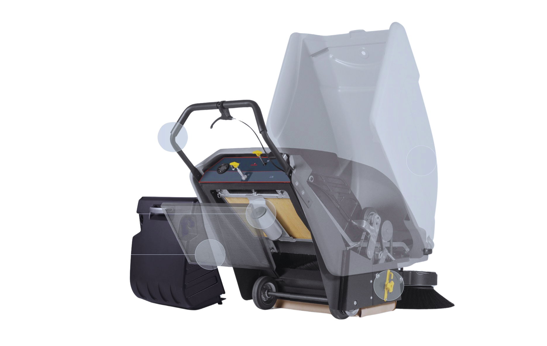 Wszystkie elementy wewnątrz zamiatarki są chronione przez obudowę z polietylenu o wysokiej gęstości oraz zderzaki boczne.